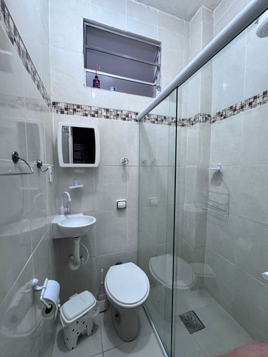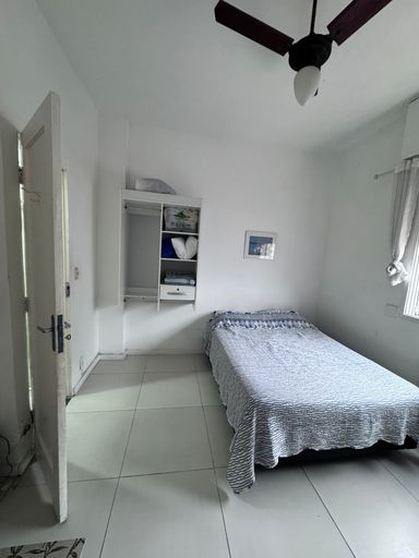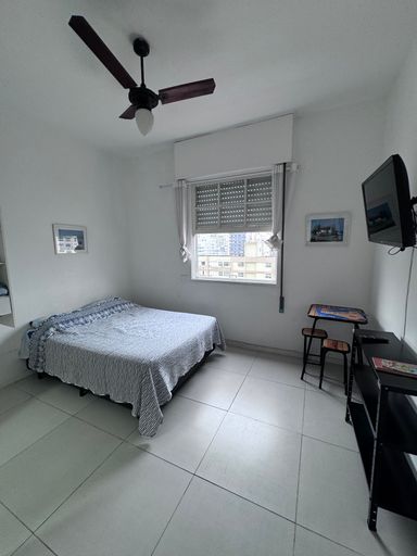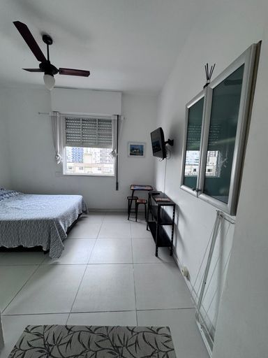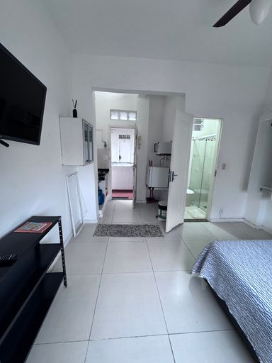 Apartamento tipo kitnet, com espaço para cama de casal e sofá, bem decorado e aconhegante.
